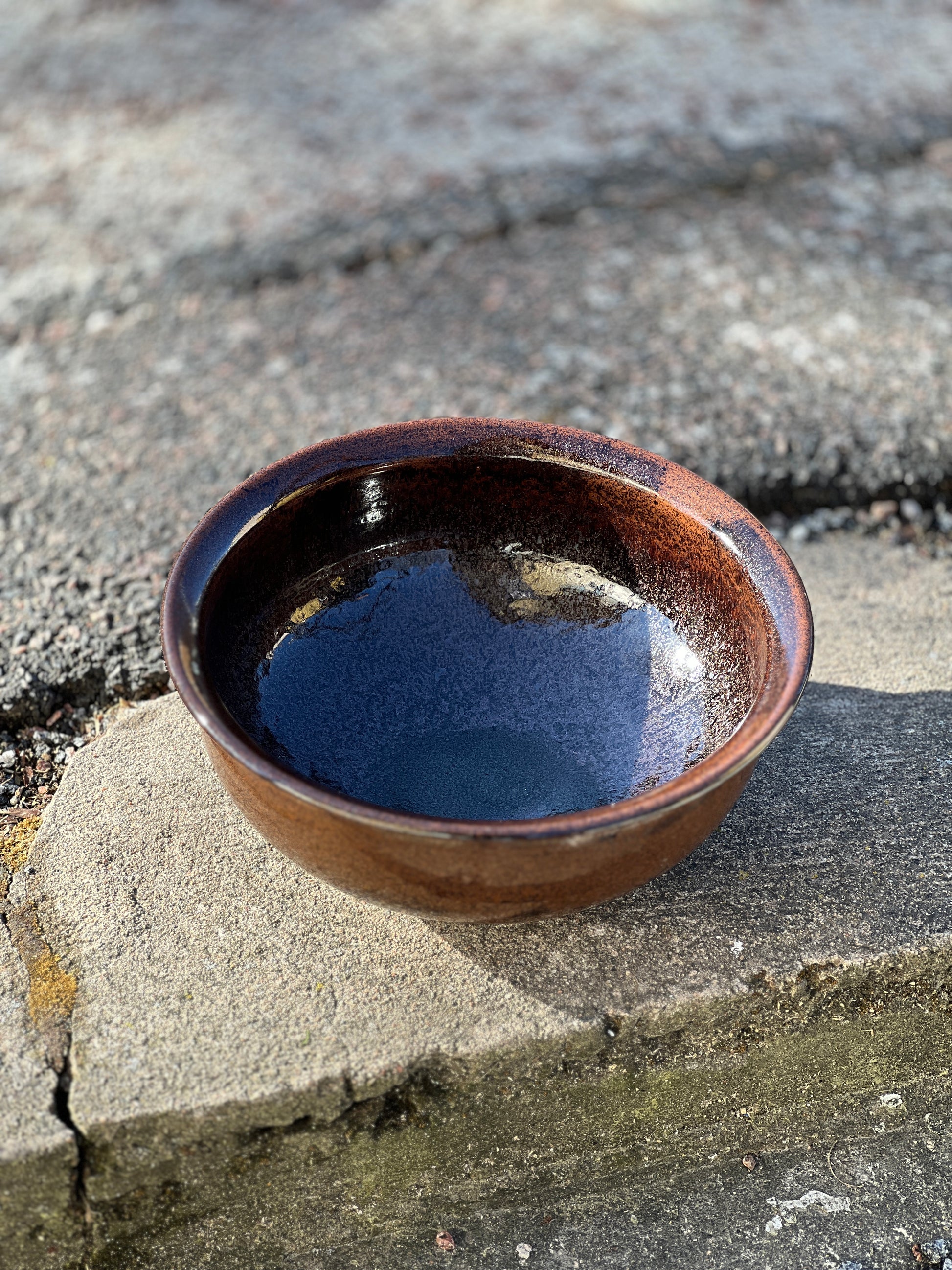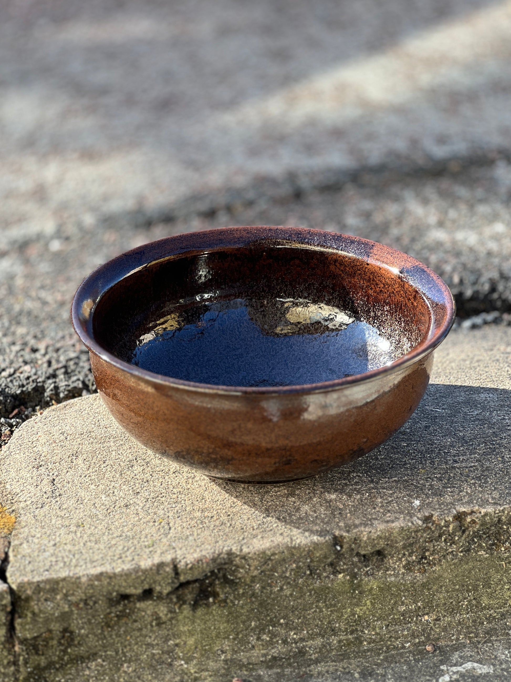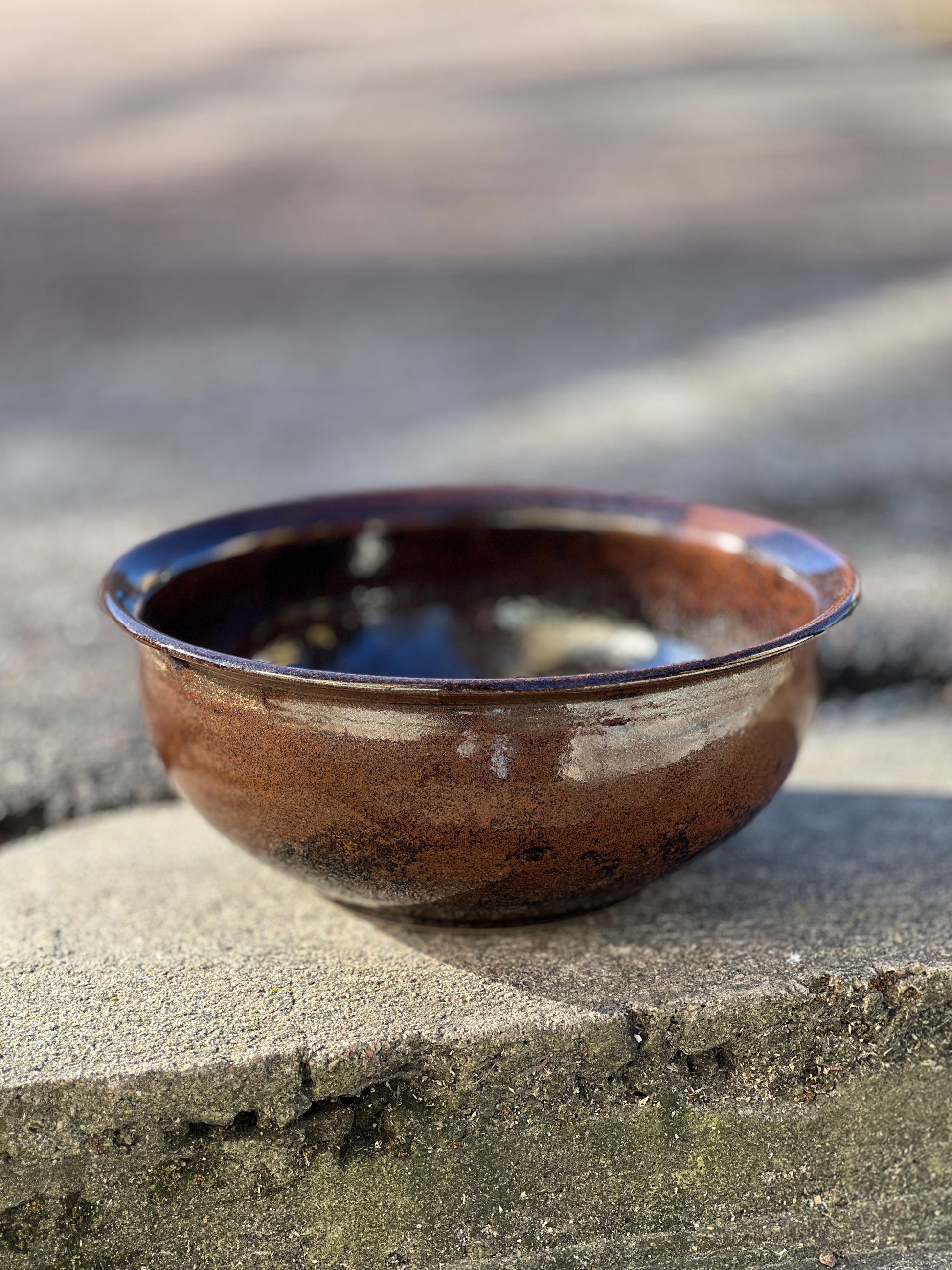 Fatet är drejat i en ljus stengodslera och glaserad i en brun glimrande glasyr.