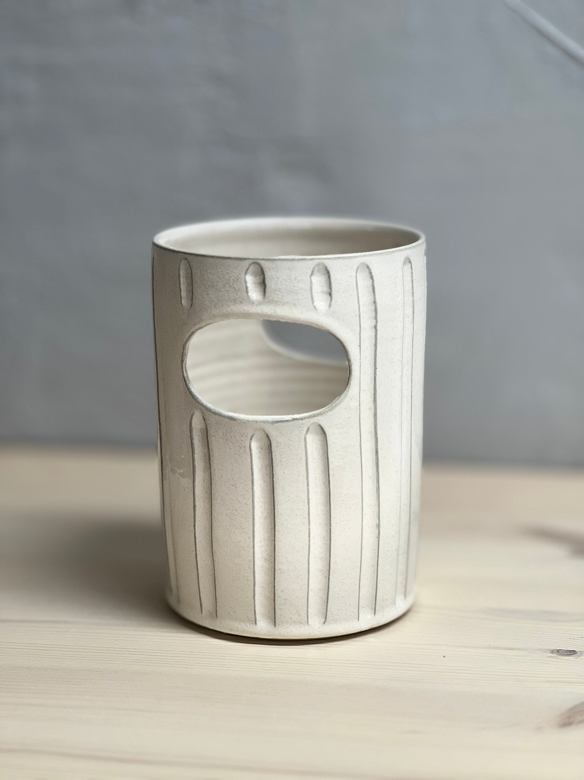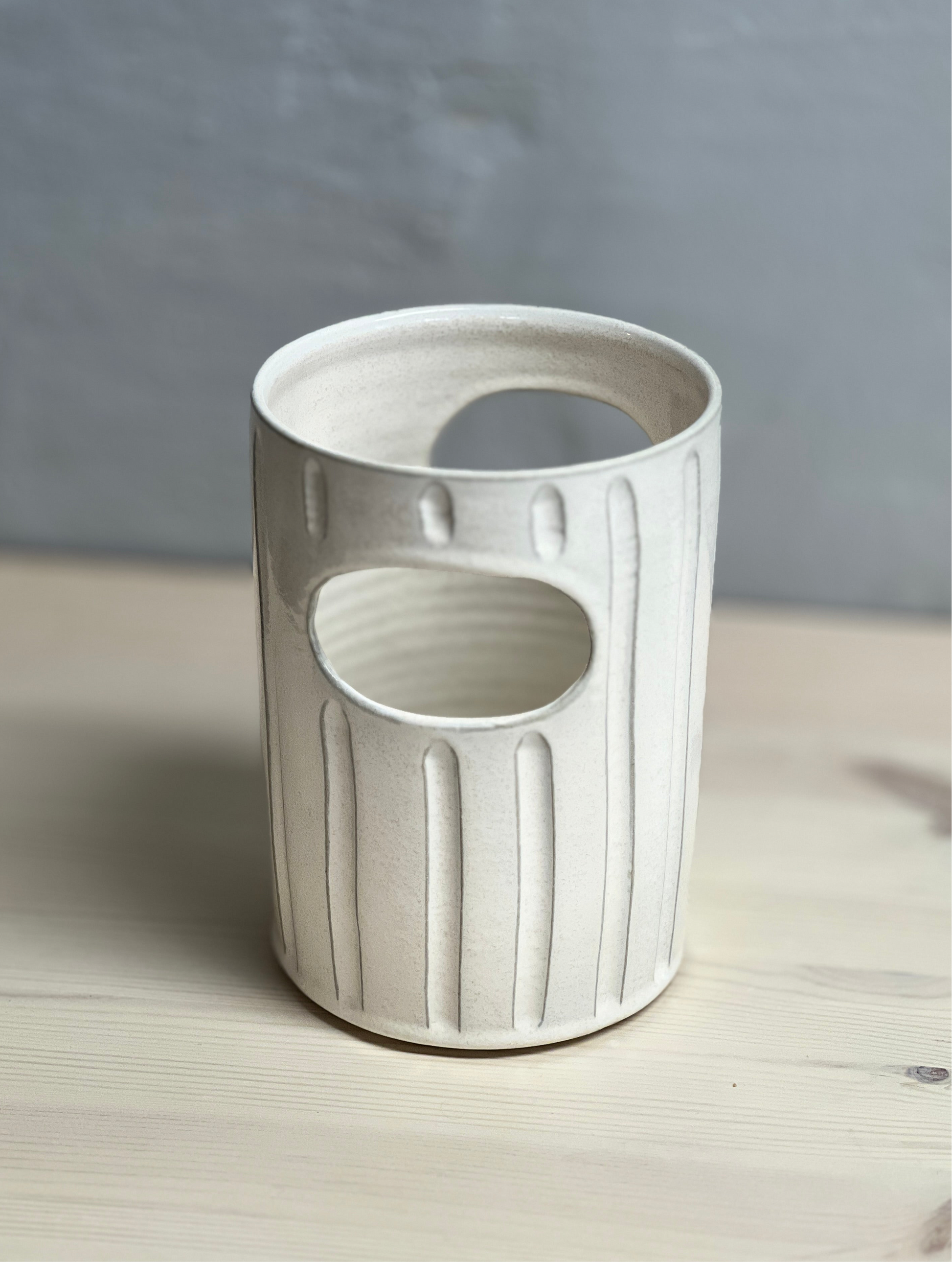 Redskapsstället är drejad i en ljus stengodslera och glaserad i en vit blank glasyr. Redskapsstället har ristade linjer på utsidan och utskurna hål som handtag.