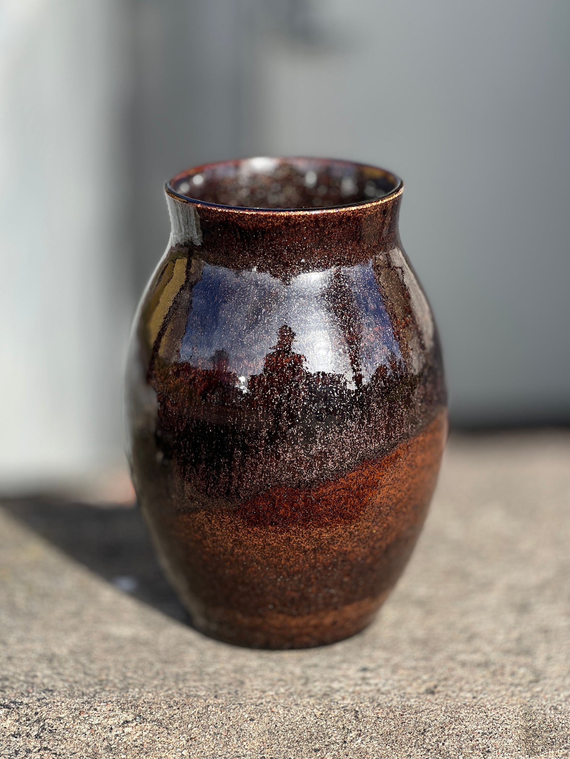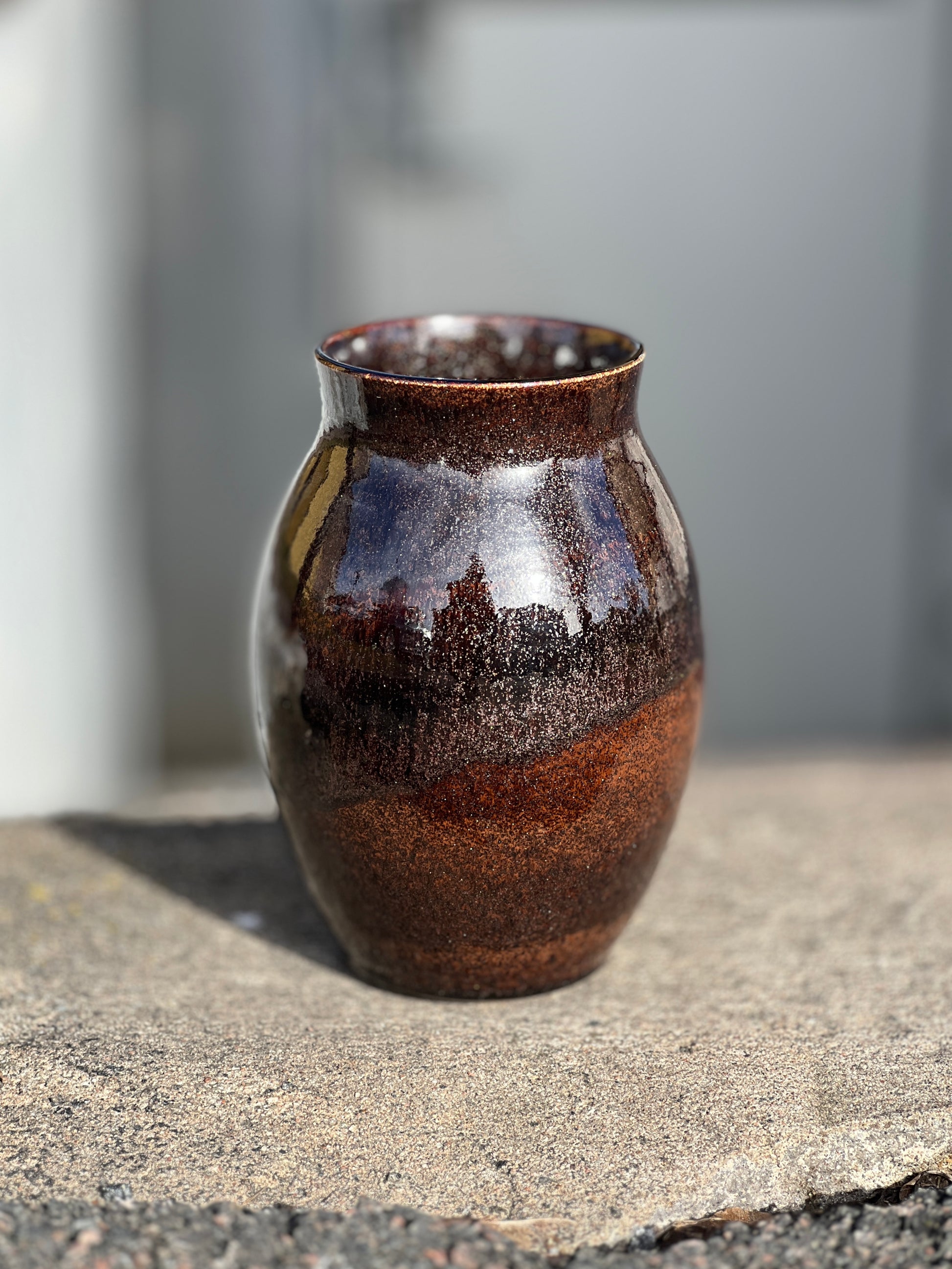 Vasen är drejad i en ljus stengodslera och glaserad i en glimrande brun glasyr. Vasens skimrande yta ger ett levande uttryck.