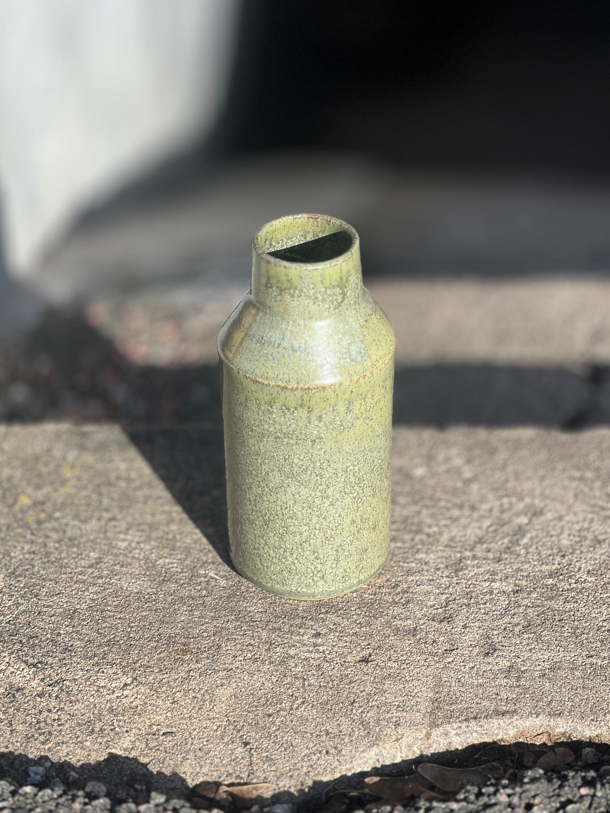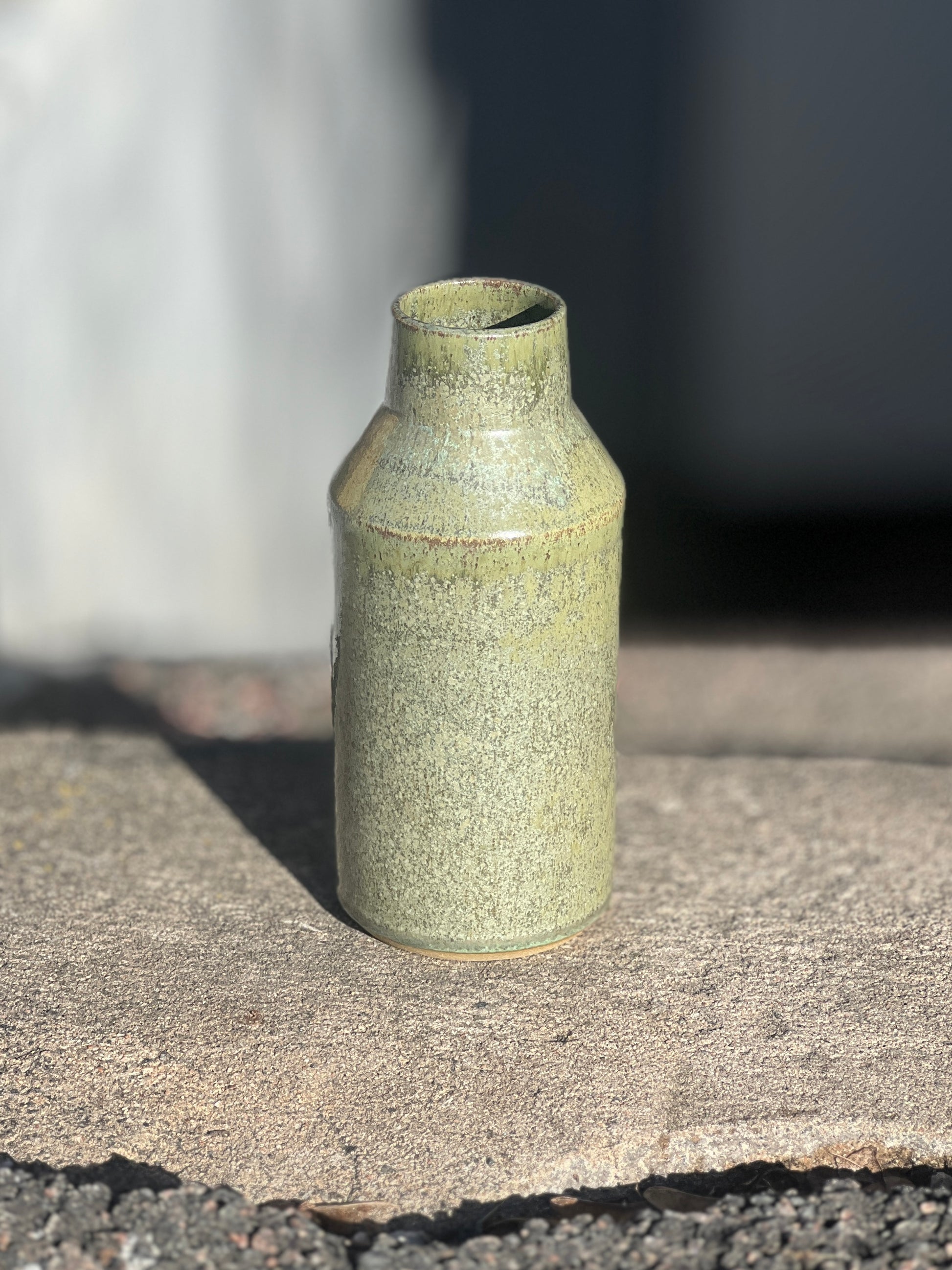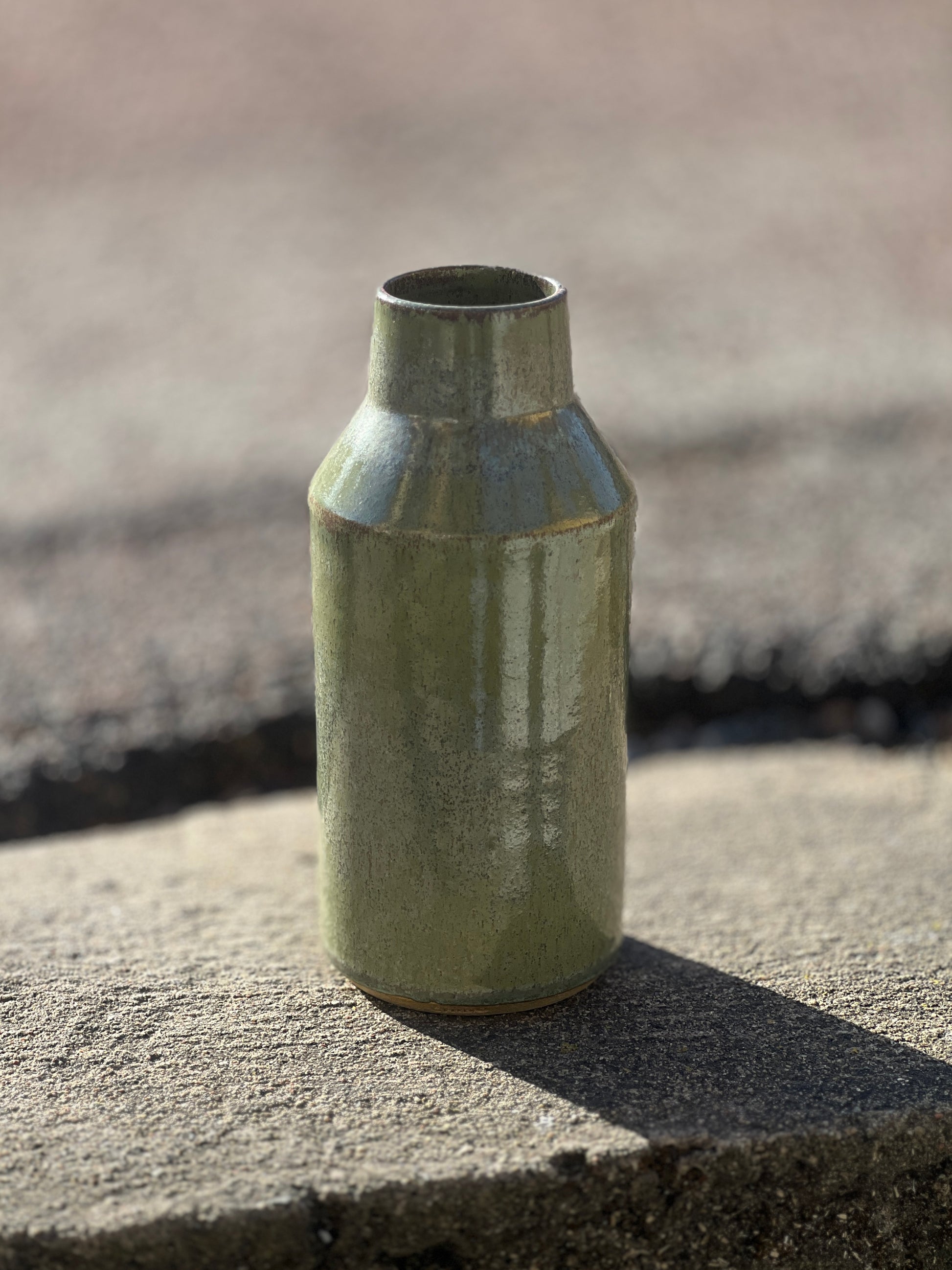 Vasen är drejad i en ljus stengodslera och glaserad i en grön blank glasyr.