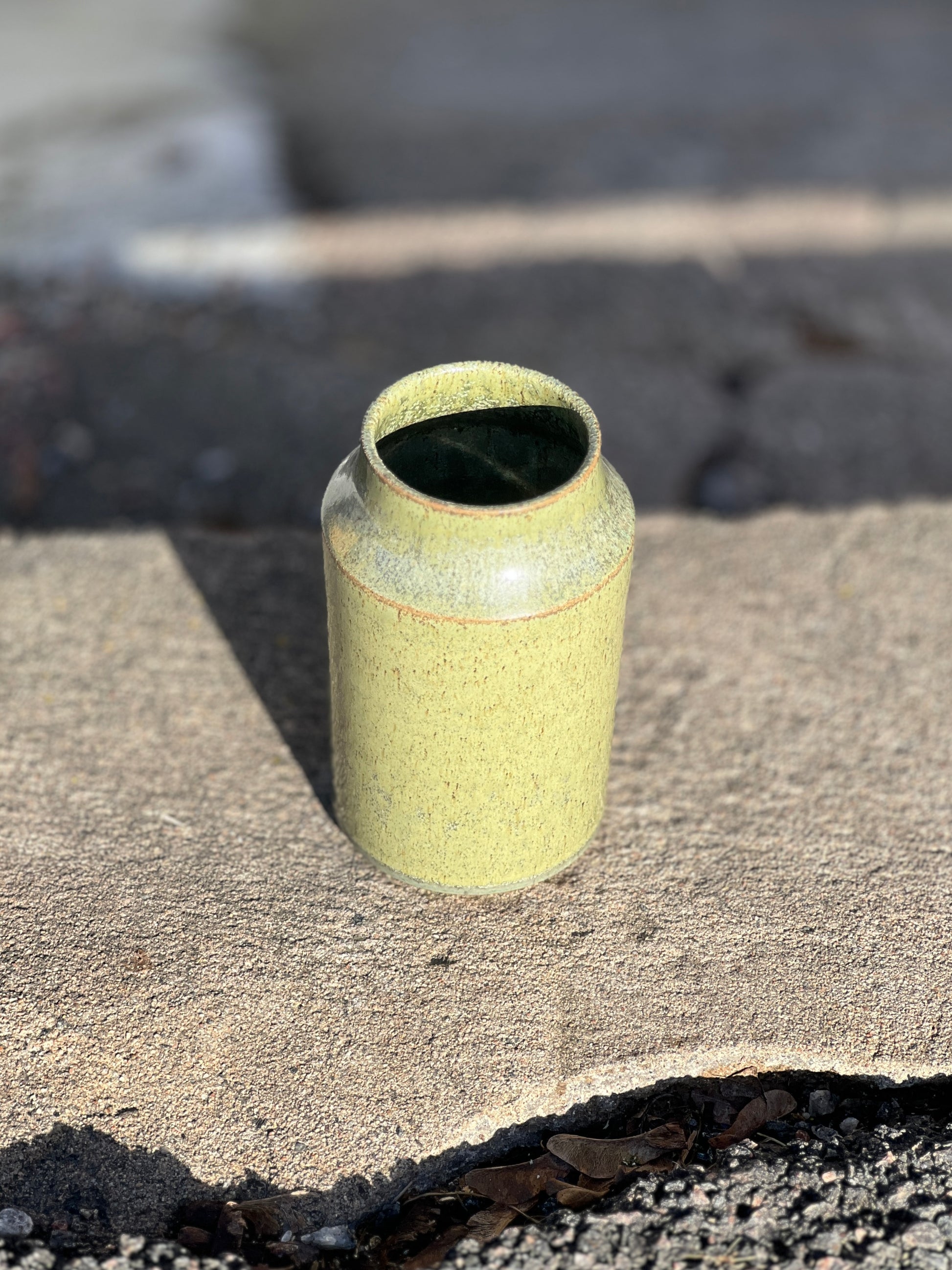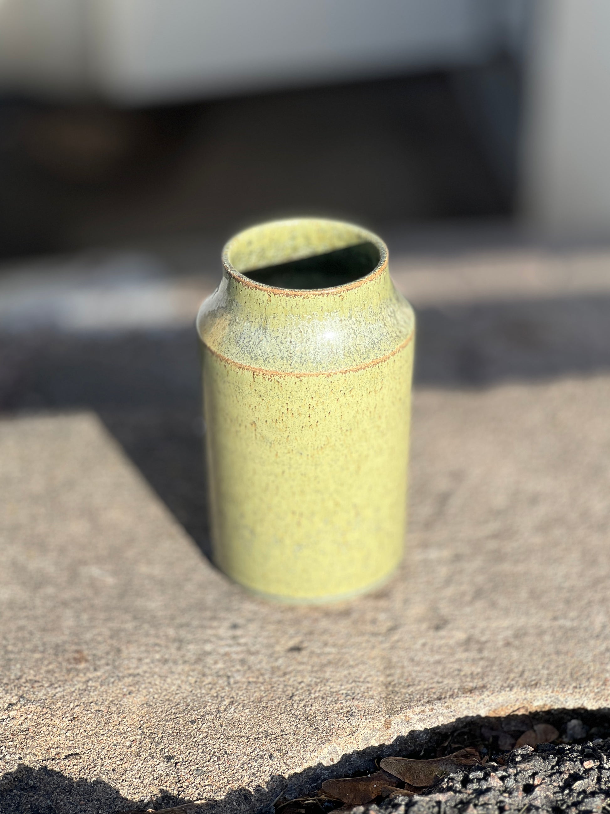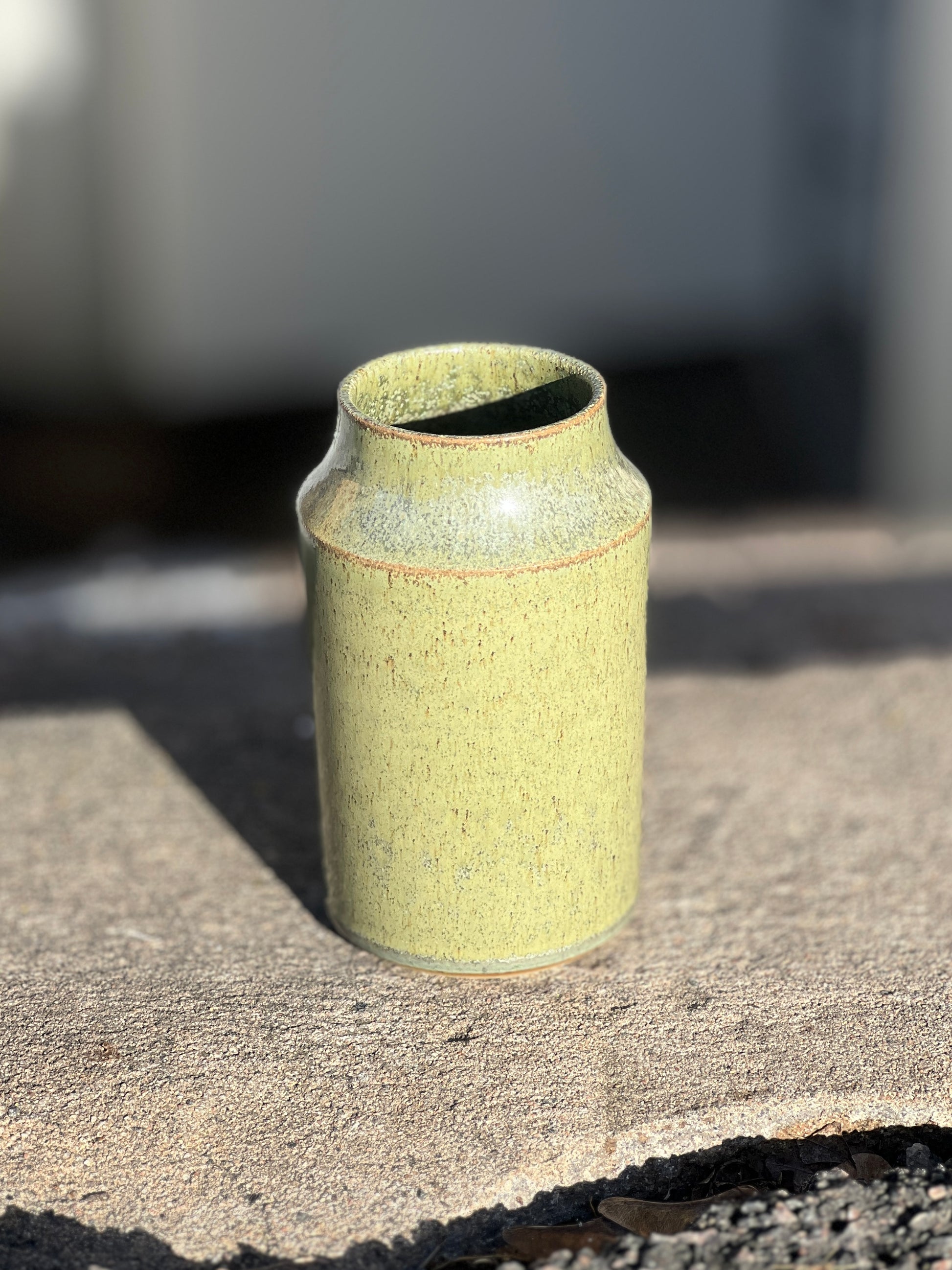 Vasen är drejad i en ljus stengodslera och glaserad i en grön blank glasyr.