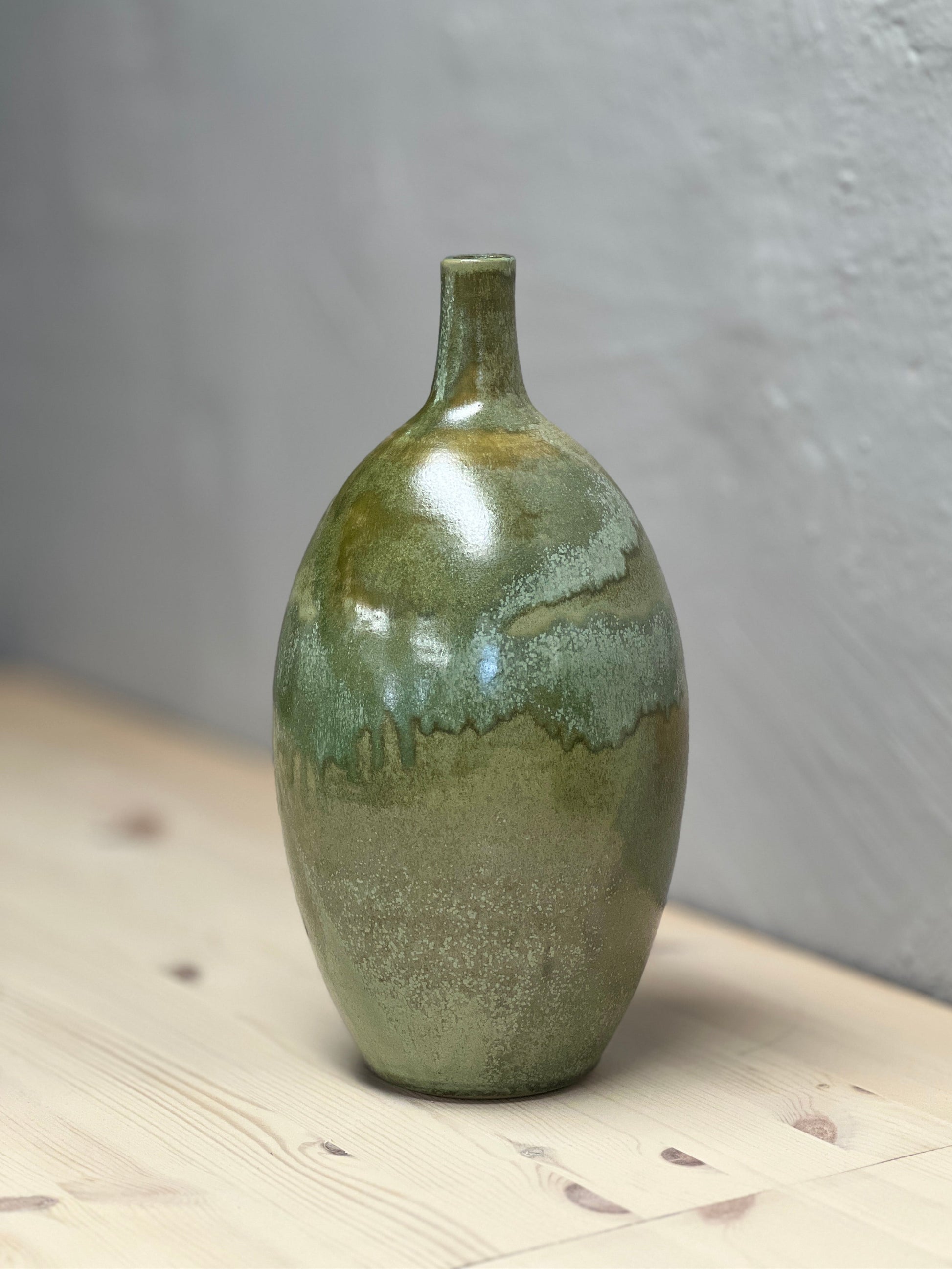 Vasen är drejad ljus stengodslera och glaserad i grön blank glasyr.